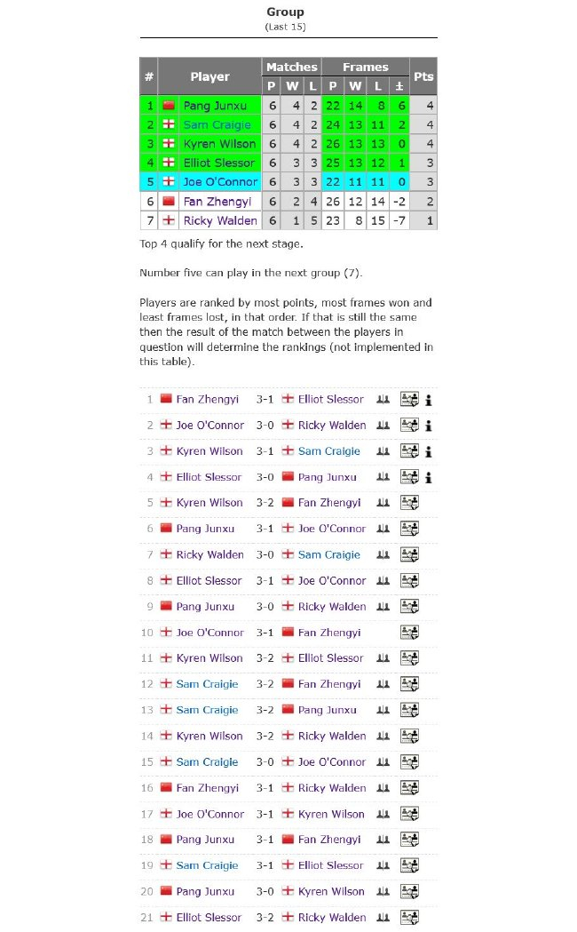 庞俊旭、克雷吉和斯莱塞也与奥康纳一谈降组到第7小组,将与罗尼-奥沙利文、杰克-琼斯和乔丹-布朗赓续争锋。第7小组的比赛将在当地工夫2月28-29日赓续进行。